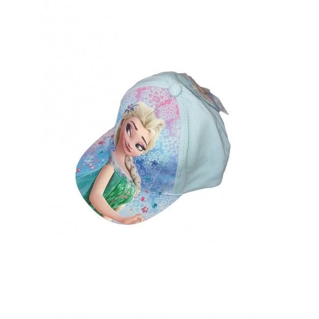 cappellino Modello: Cappellino Cappellino berretto bimba fondo cielo con stampa Elsa Disney frozen su sfondo cielo sul davanti visiera rosa rifinito con bordo con chiusura a strappo con velcro lato posteriore Art: C1761 Materiale: 80% cotone + 20% poliestere Colore: cielo Caratteristiche:taglia 48