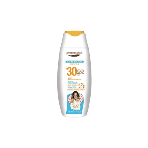 Latte solare protettivo per la pelle sensibile del bambino. Testato dermatologicamente. Profumo ipoallergenico. Senza Parabeni. Nickel Tested.